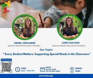 Join Merel Vervaene and Lore Van Dam, Special Needs Education students, for an empowering workshop series designed to help educators create truly inclusive learning environments. Dates:- 25 October 2025- 1, 15, 22 November 2025 Time: 2:00 PM – 5:00 PM Venue: TDSO Campus What You’ll Gain:By the end of this workshop
