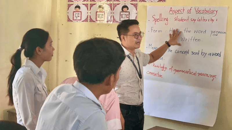 In this dimension, TDSO works with teachers who may teach entirely in Khmer with no English component. The focus is purely on strengthening pedagogical practice using the principles derived from CLT: practice-based learning, peer collaboration, systematic progression, continuous coaching, and evidence-based refinement.