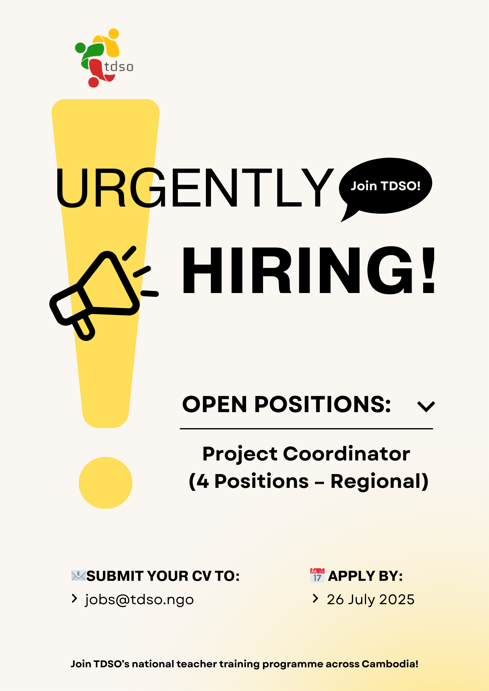 Job Title: Project Coordinator (4 Positions-Regional) Position Overview TDSO (Teacher Development Support Organization) is seeking 4 motivated Project Coordinators to support the implementation of a large-scale teacher training program across 18 provinces in Cambodia. Each Project Coordinator will be responsible for overseeing the program rollout in 4 provinces within a defined region and will be based at a regional office