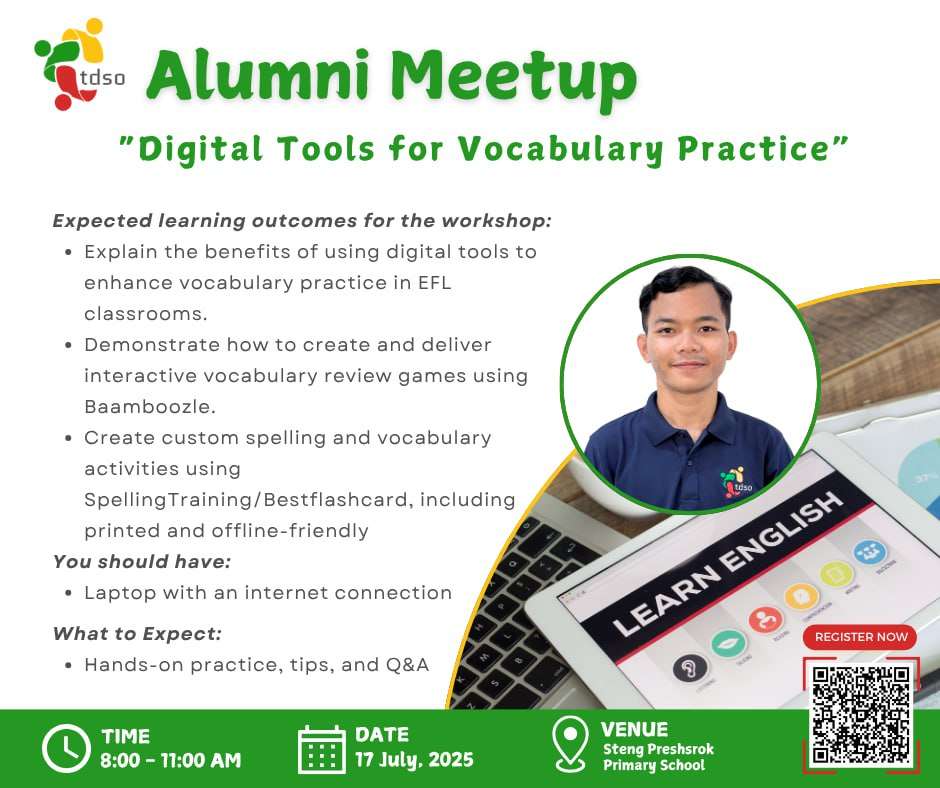 Join us for an exciting IT workshop on “Digital Tools for Vocabulary Practice” led by Mr. Kan Sokhit, TDSO’s IT Coordinator.  Date: Thursday, 17 July 2025 Time: 8:00 – 11:00 AM Venue: Steng Preshrok Primary School  What you’ll learn:• How to use tools like Baamboozle, SpellingTraining, and Bestflashcard for fun and effective vocabulary practice• Tips for creating interactive review games
