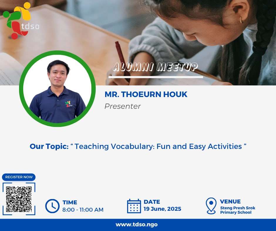 Join us for an engaging in-person session with Mr. Thoeurn Houk, where you’ll explore creative methods to teach vocabulary that are both effective and enjoyable for learners of all levels.  Date: Thursday, 19 June 2025 Time: 8:00 AM – 11:00 AM Venue: Steng Preah Srok Primary School  Learning Outcomes:- Acquire effective techniques to elicit new words in context- Explore authentic