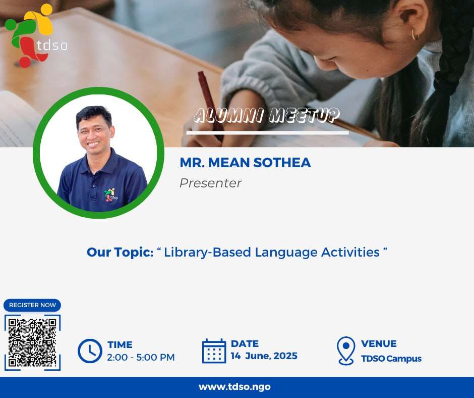 Join us for an interactive session with Mr. Mean Sothea, where we’ll dive into practical ways to bring language learning to life through engaging library activities.  Date: Saturday, 14 June 2025 Time: 2:00 PM – 5:00 PM Venue: TDSO Campus  Learning Outcomes:- Recognise students’ reading habits- Identify a variety of library-based activities- Practise using these activities to enhance language learning