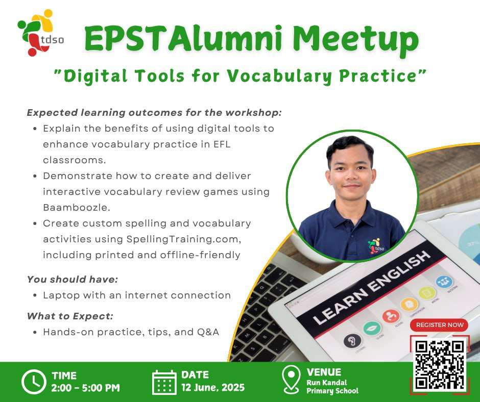 Join us for a hands-on session with Mr. Kan Sokhit as we explore creative and engaging ways to teach vocabulary using digital tools.  Date: Thursday, 12 June 2025 Time: 2:00 PM – 5:00 PM Venue: Run Kandal Primary School  Learning Outcomes:- Explain the benefits of using digital tools for vocabulary teaching- Use SpellingTraining and BestFlashcard effectively in your lessons- Create