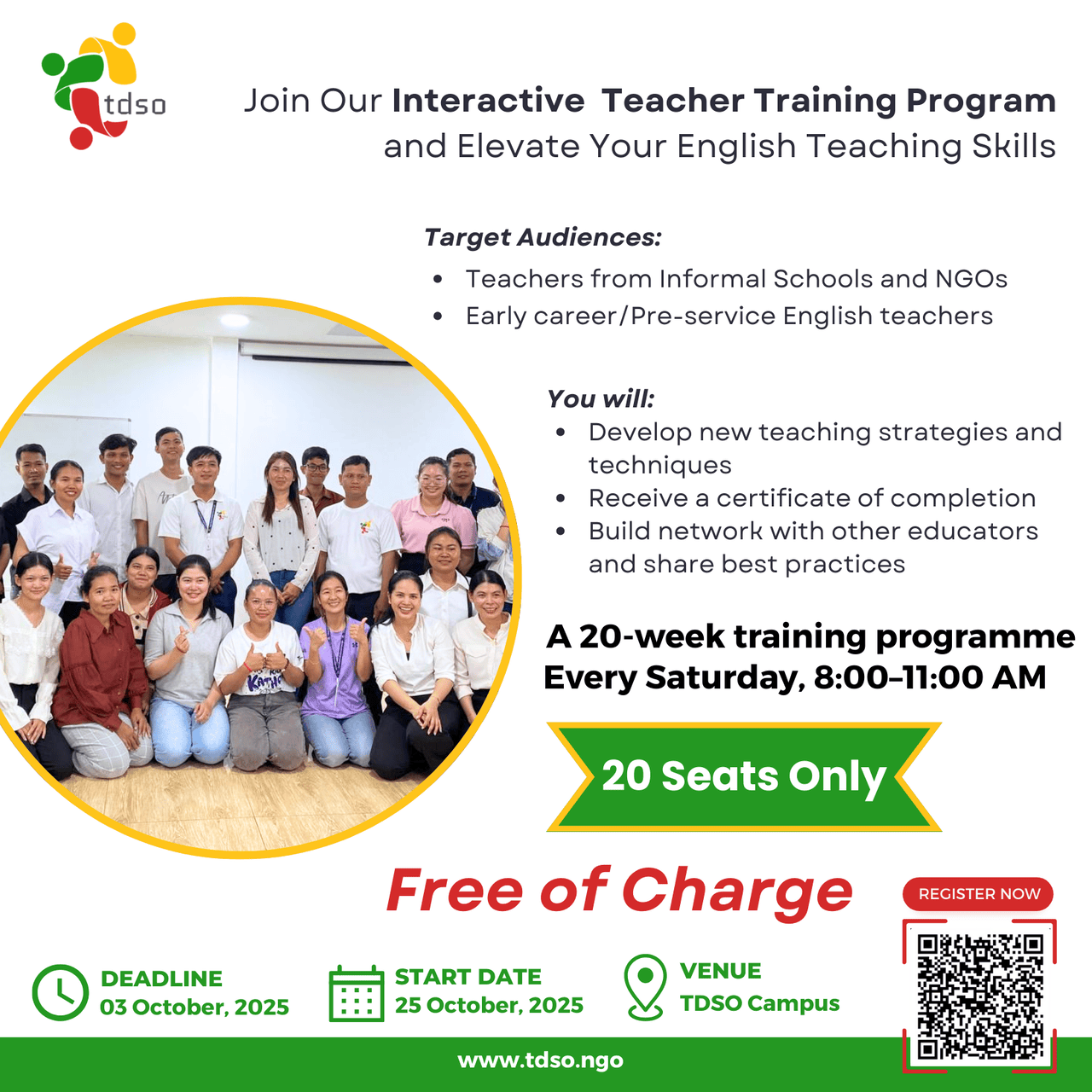 If you are an early-career English Teacher and want to significantly improve your teaching skills, you are welcome to join this program. It will start on the 25th of October and continue every Saturday morning until the end of March 2026. The workshops will be held at the TDSO campus in Siem Reap. The course participants are deemed to have