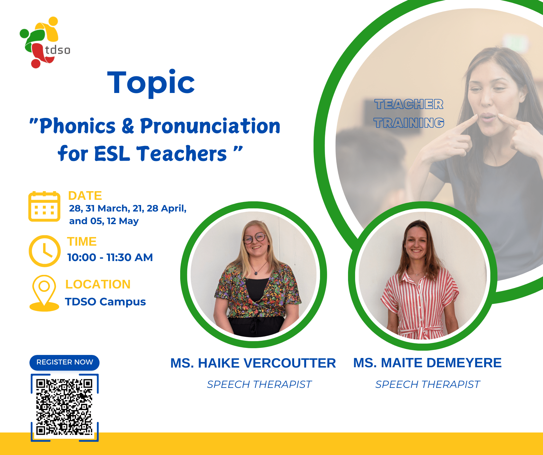 Enhance your ESL teaching with expert-led training in phonics and pronunciation! This in-person workshop series, led by speech therapists Ms Haike Vercoutter and Ms Maite Demeyere, will equip you with essential techniques to improve pronunciation and students’ learning experience. Workshop Dates: 📅 March 28, 31📅 April 21, 28📅 May 5, 12 🕙 Time: 10:00 – 11:30 AM📍 Location: TDSO Campus