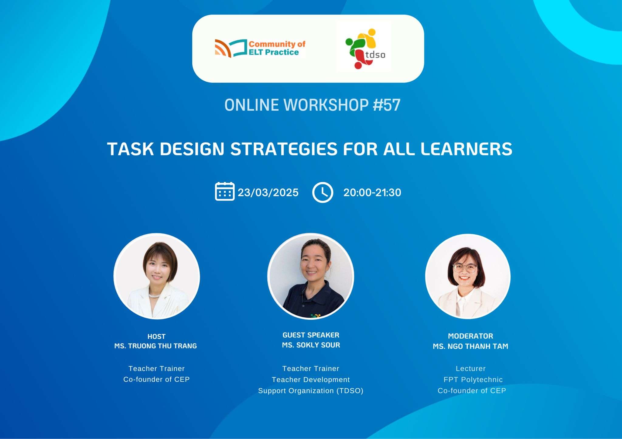 Looking for practical ways to boost student engagement? Join the Community of ELT Practice and TDSO’s Online Workshop to explore effective task design strategies that make language learning more dynamic and inclusive for all learners!  Host: Ms. Truong Thu Trang – Teacher Trainer & Co-founder of CEP Guest Speaker: Ms. Sokly Sour – Teacher Trainer, TDSO – Teacher Development Support Organization