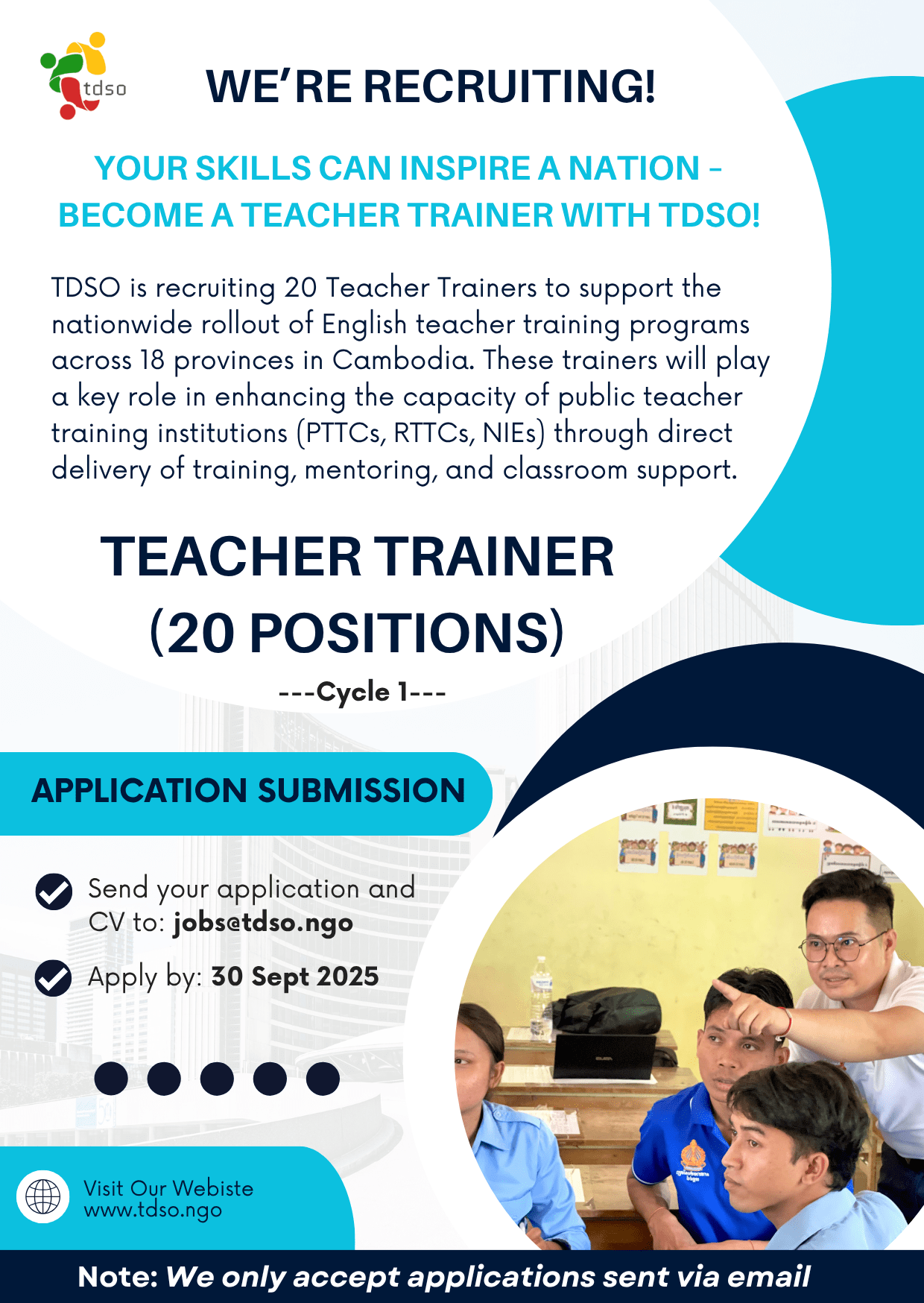 TEACHER TRAINER (20 Positions Cycle 1)TDSO | Cambodia (National Deployment – Based in 18 Provinces) Position OverviewTDSO is recruiting 20 Teacher Trainers to support the nationwide rollout of English teacher training programs across 18 provinces in Cambodia. These trainers will play a key role in enhancing the capacity of public teacher training institutions (PTTCs, RTTCs, NIEs) through direct delivery of