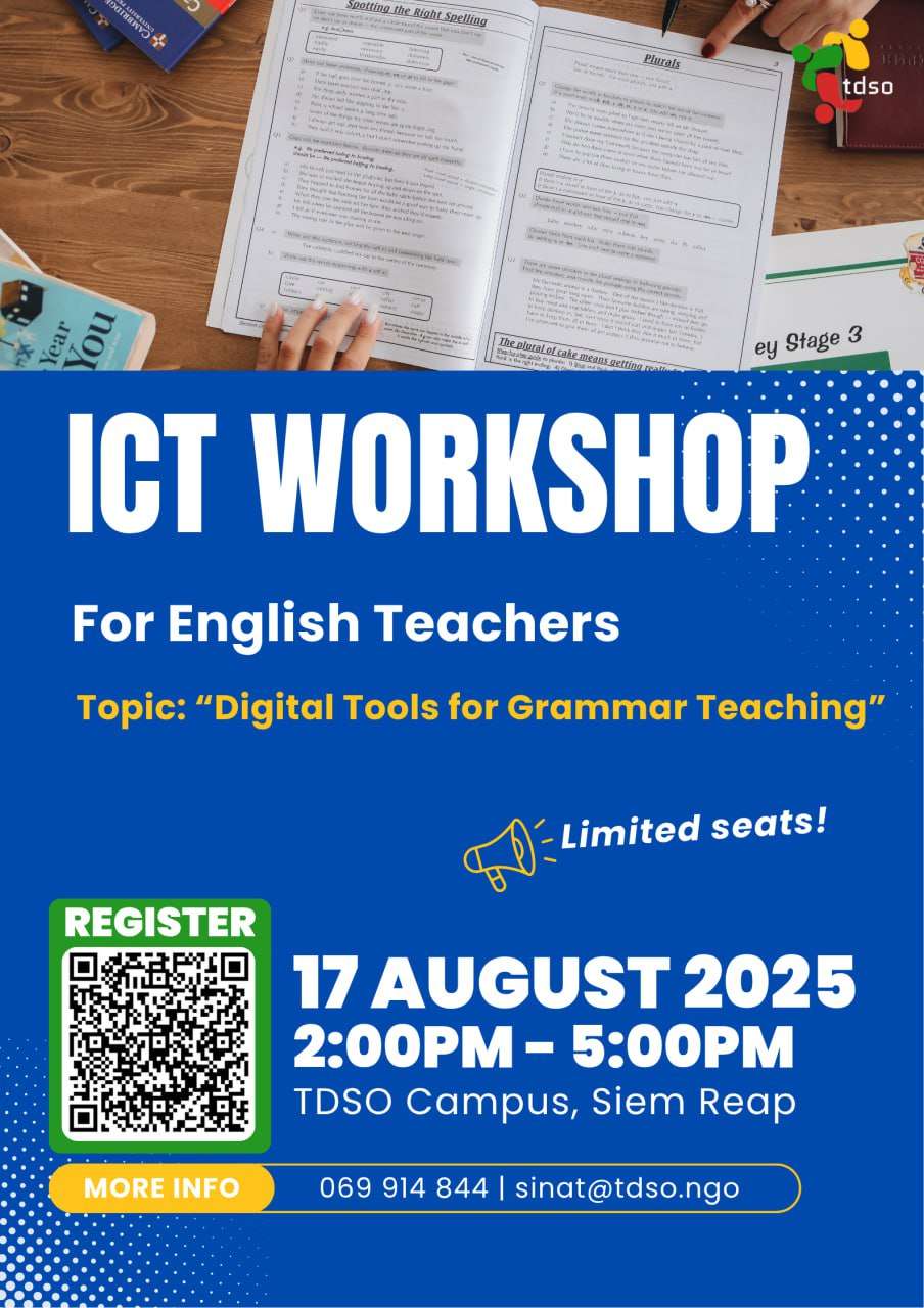 ICT Workshop for English Teachers – Don’t Miss Out! Topic: Digital Tools for Grammar Teaching Join us for a hands-on and engaging workshop with Mr. Kan Sokhit, designed to enhance your grammar teaching with modern technology.  Date: Sunday, 17 August 2025 Time: 2:00 PM – 5:00 PM Venue: TDSO Campus, Siem Reap  Learning Outcomes:- Use video tools for grammar presentation- Identify effective