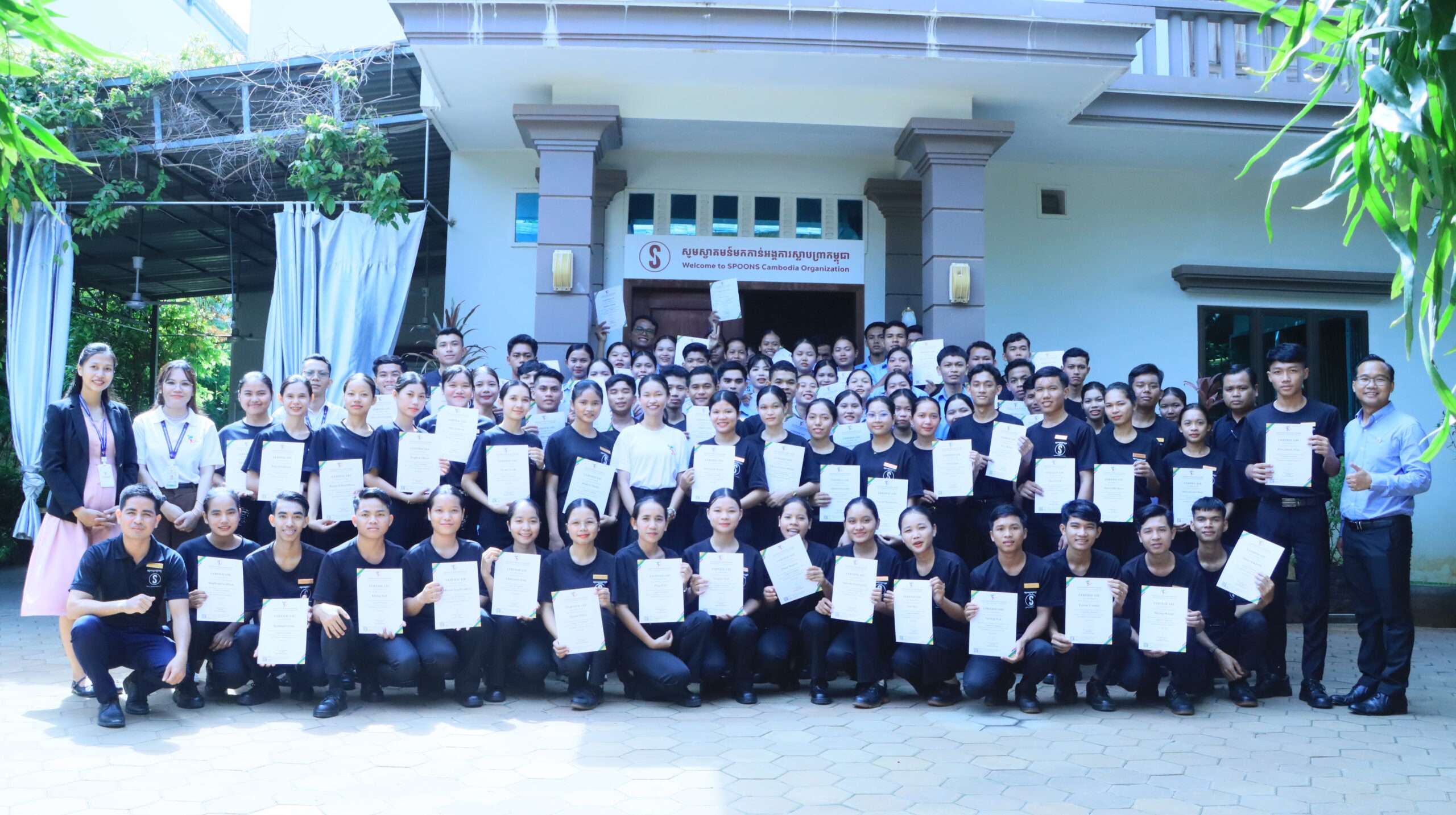 On 30 July, 78 students successfully completed their English for Hospitality training under the TDSO – Teacher Development Support Organisation and SPOONS Cambodia Organization partnership. The training equips students with practical English skills tailored to real-world needs in the hospitality sector. With previous cohorts achieving a 100% employment rate within two weeks, demand for graduates continues to rise among local